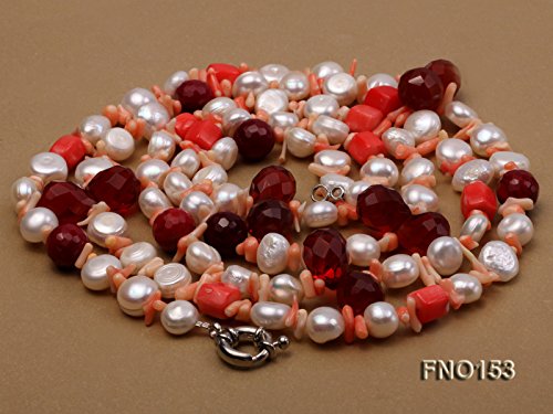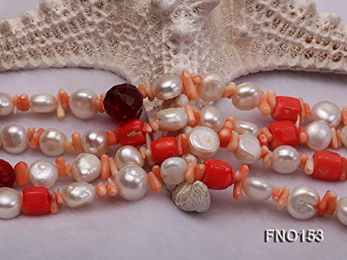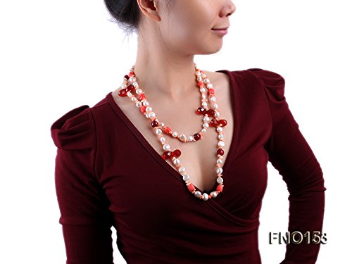 Fashionable necklace is made up of 11-12mm freshwater pearl and alternated with crystal and coral beads. Its length is 55 inches.