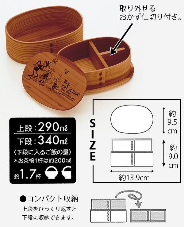 天然木ならではのやさしい風合い。軽量で持ち運びがしやすく、優れた通気性があります。夏はご飯が傷みにくく、冬は保温性が高まります。上段をひっくり返すと下段に収納できるので、コンパクトになります。 |