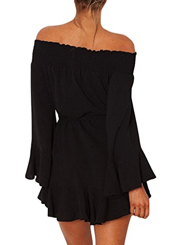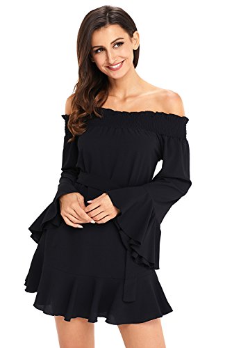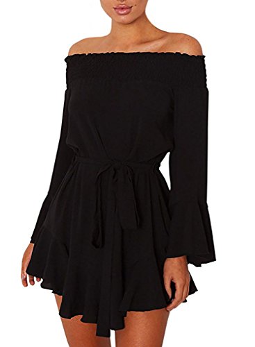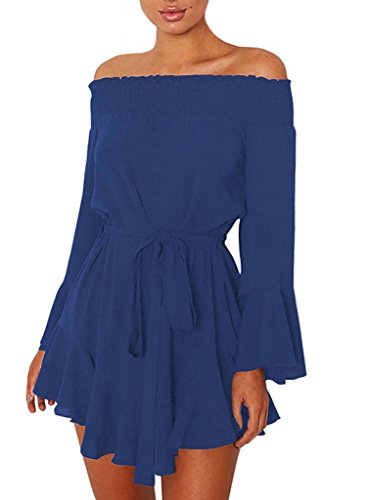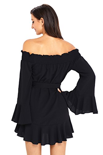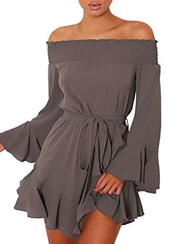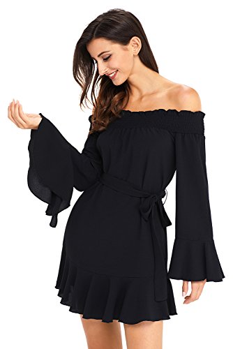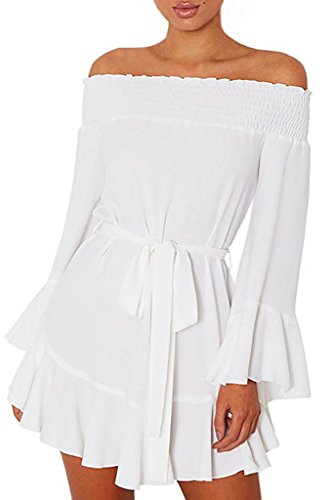 ROSKIKI Women's Long Bell Sleeve Off Shoulder Blouse Ruffle Belt Mini DressFeature