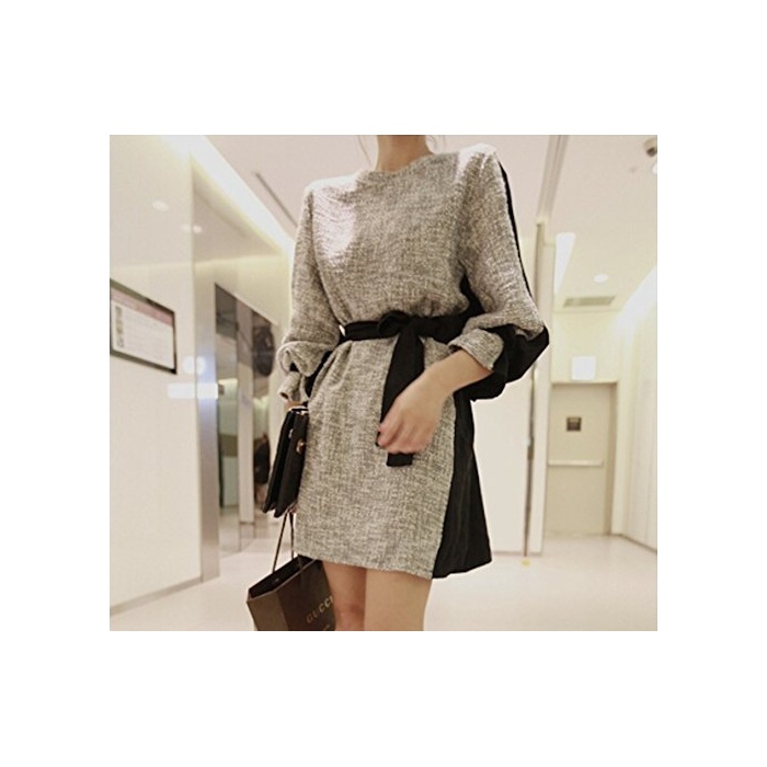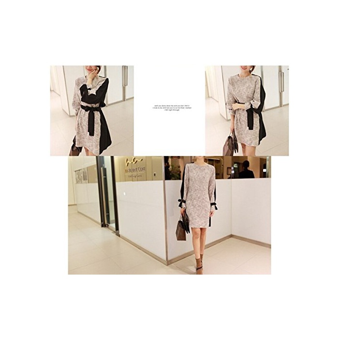 Ange select ange select 침착성이 있는 어른 여성 에 바이 컬러 원피스 긴 소매 웨스트 리본 긴축 멋쟁이 캐주얼 외출 스타일