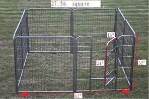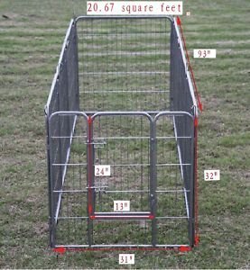 Each Panel is 32" High, 31" Wide One easy to open door Heavy Duty 1/2" Tube Frame. Heavy Duty Pet Playpen is the must have for your dog, it is easy to set up and you have tons of way to set it up both indoor or outdoor.