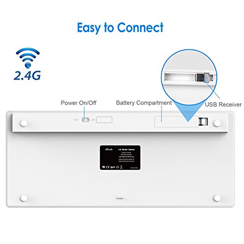 Package includes: JETech wireless keyboard with nano receiver, instruction manual, warranty