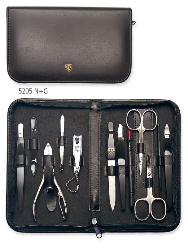 -. Feature : Contents: Nail scissors, cuticle scissors, nail clipper, nail nippers, sapphire nail file, nail cleaner (small), hoofstick, nail cleaner, cuticle pusher, cuticle scratcher, nail stick, tweezers / Surface of steel implements: bright nickel plated, polished / Case: Synthetic leather black • Delivered in an attractive THREE SWORDS gift box • Made in Solingen/Germany since 1927 (except nail clipper/s) / Perfectly groomed / manicured finger nails are your visit card as well as a perfect make up! In the US / USA on AMAZON only: Our wide range of high quality manicure-pedicure-nail-care-grooming-beauty-cosmetic-toiletry products / tools / accessories / sets / kits / cases for women / woman / girls and men / man, suitable for home and travel use. Most of our sets fit into almost any handbags / shoulderbags. / Your are looking for a perfect present for your wife / daughter / husband / girl friend / mom / dad or do not know how to use your gift card? A manicure set is ideal for XMAS, christmas, birthday, birth, mothers day, fathers day, marriage, thanksgiving, valentines day and all further occasions - finest quality by THREE SWORDS GERMANY since 1927.