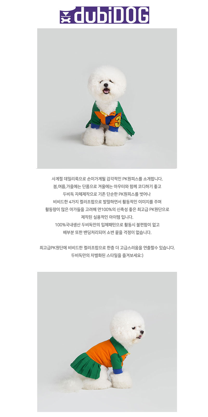 | 사계절 데일리룩으로 손이가게될 감각적인 PK원피스를 소개합니다. 봄,여름,가을에는 단품으로 겨울에는 아우터와 함께 코디하기 좋고 두비독 자체제작으로 기존 단순한 PK티셔츠를 벗어나 비비드한 4가지 컬러조합으로 발랄하면서 활동적인 이미지를 주며 활동량이 많은 아가들을 고려해 면100%의 신축성 좋은 최고급 PK원단으로 제작된 실용적인 아이템 입니다. 100%국내생산 두비독만의 입체패턴으로 활동시 불편함이 없고 배부분 또한 밴딩처리되어 소변 뭍을 걱정이 없습니다. 최고급PK원단에 비비드한 컬러조합으로 한층 더 고급스러움을 연출할수 있습니다. 두비독만의 차별화된 스타일을 즐겨보세요:) |
