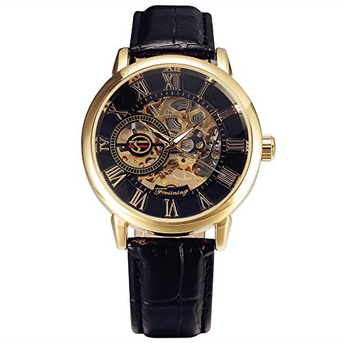 -. Title : F002-BL FORSINING 3dロゴデザイン中空彫刻ブラックゴールドケースレザースケルトンMechanical Watchesメンズラグジュアリーブランド