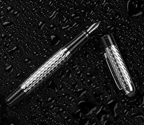 HIGH-QUALITY FOUNTAIN PEN SET: Get smooth and resilient writing with no smudges every time with the KING NIB FOUNTAIN PEN SET; set includes a silver metal writing pen with engravings, black inserts, and matching cap with pocket clip, 2 nibs, 2 30ml ink bottles with 2 converters, stylus, and uniquely nib-shaped gift box as well as instructions, duster, notebook, and greeting card; dimensions of the pen are 5.5-inches long by 0.5-inch in diameter;