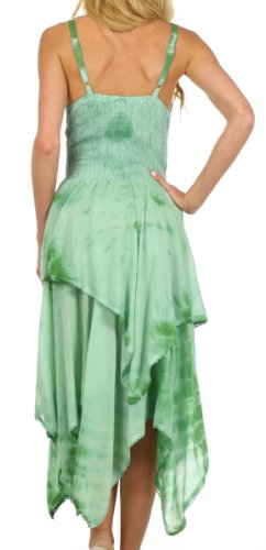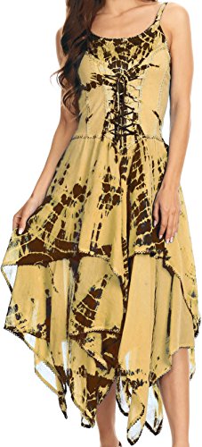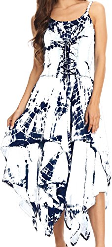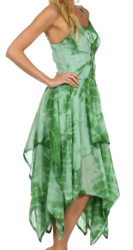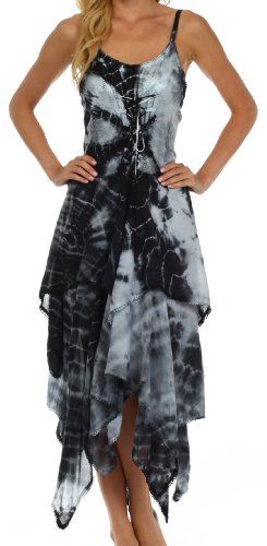 Sakkas' batik dresses feature rich tie dye colors, lace up corset style bodice and a full double layer handkerchief hem skirt. Enjoy wearing a flattering feminine dress without sacrificing comfort!