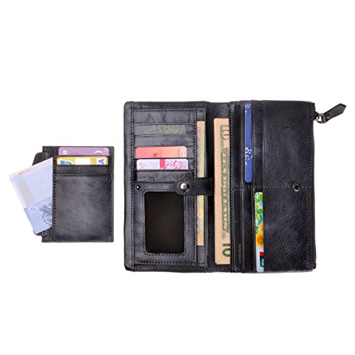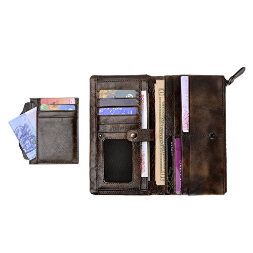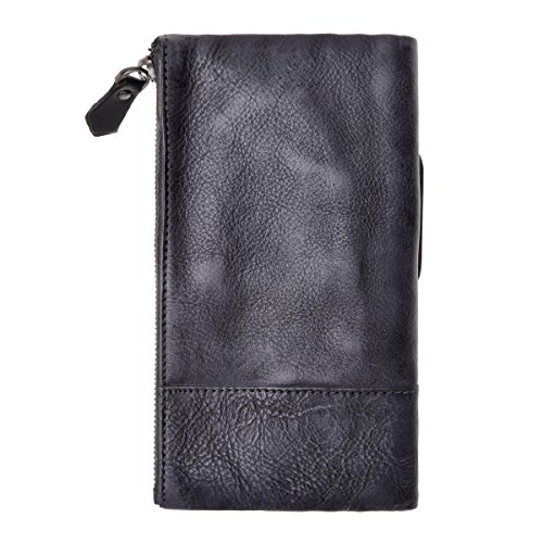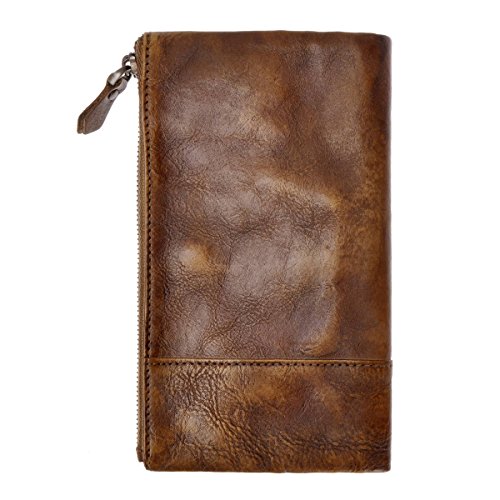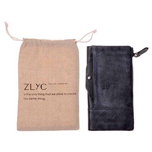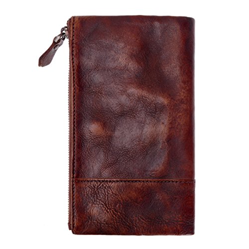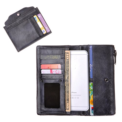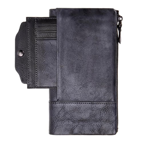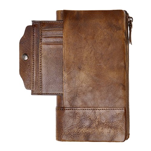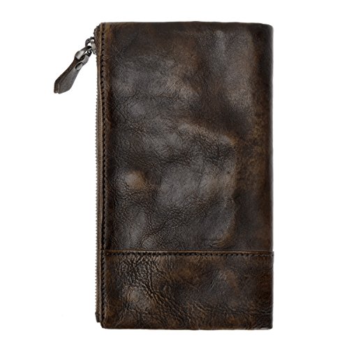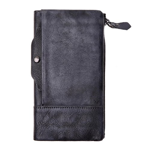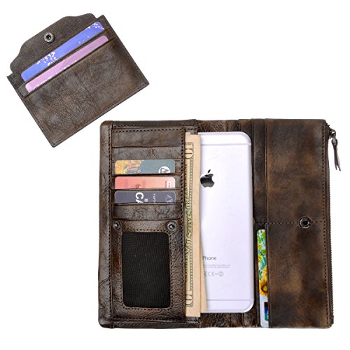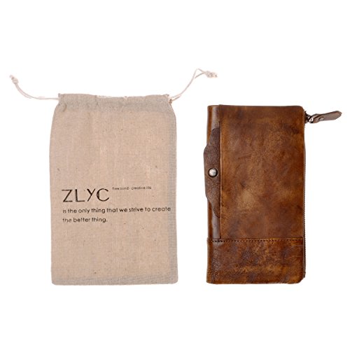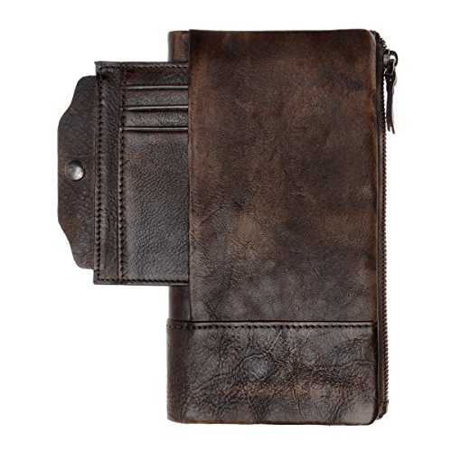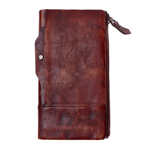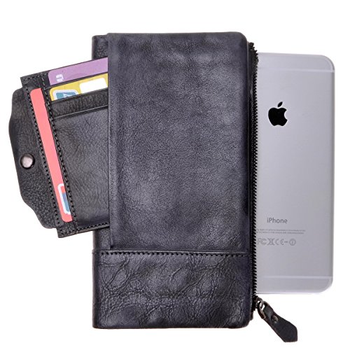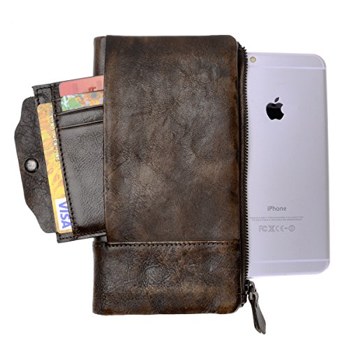 This distressed dip-dye leather wallet features a large foldover with slots for cards and bills as well as a built-in zip pouch for anything you need to keep extra safe, the zip pouch size may fits an iPhone 6 Plus. Snap closure. You can also carry it as a clutch.
