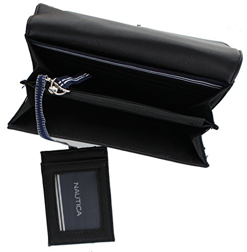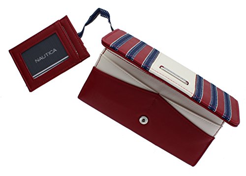 -. Binding : Apparel -. Brand : Nautica -. Department : womens -. Feature : • Rich looking Faux Leather. Nautica Reaction Name Plate , 7.5" x 4" x 1.25" / • RFID Blocking Protection Will keep your identity Safe from Thieves that can scan your wallet / • 1 Back Side zipper pocket. Beautiful Striped Design / • 1 inner zipper pocket for coins , 3 open inner pockets , 6 credit card slots / • 1 Pull out ID window with 2 credit card slots. -. ProductGroup : Apparel -. ProductTypeName : ACCESSORY -. Size : One Size -. Title : Nautica Straight Away Pull Out ID Clutch Wallet Organizer With RFID