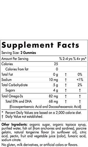 Our Nordic Omega-3 Gummie Tangerine Treats provide your daily dose of Omega-3 in a fun, yummy, gummy. These gummies are great for men, women, and children alike, making it easy to get your dose of Omega-3 without the fishy taste. Omega-3 and specifically DHA and EPA play an important role in healthy brain development for growing children. These are a great way to start your toddler on a childrens vitamin they will look forward to taking. But they're not just for kids. Omega-3 fatty acids help support healthy heart function in adults, too. The best part is they are all natural. They have no artificial flavors or preservatives and are gelatin, gluten and diary free.