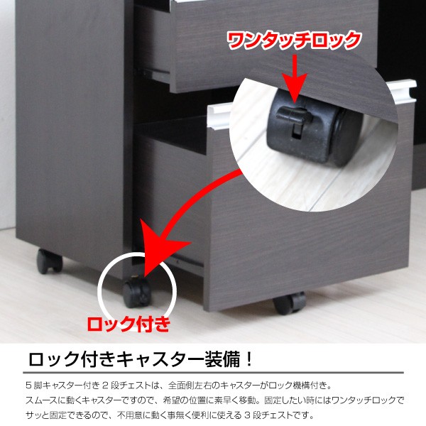 ■2段チェストのキャスター部は前面部ストッパー付きで思い通りの位置で固定可能。