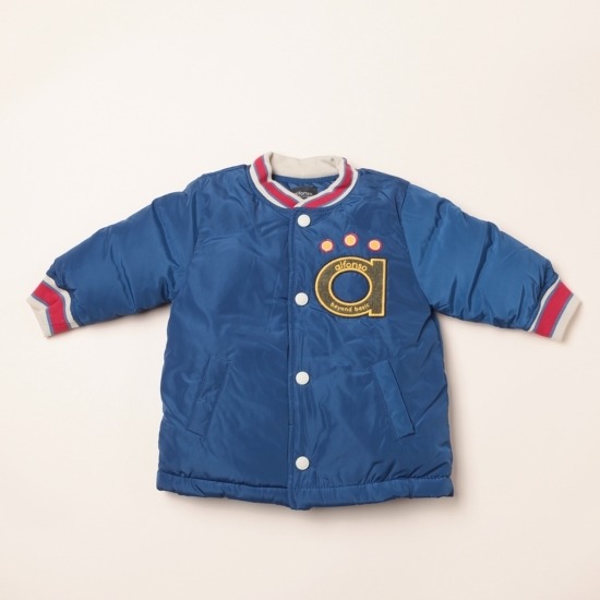 블루컬러의 화섬소재 웰론 가벼운 충전재 점퍼엉덩이 덮는기장,손목과 에리 요꼬시보리 사용요꼬시보리 칼라배색으로 멋스러움을 더함앞 오픈 시리콘 스냅사용, 입어서 왼쪽 가슴부분`a`자 로고 자수로 포인트를 줌