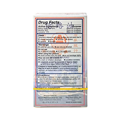 -. Binding : Health and Beauty -. Brand : Hysan -. EAN : 0695216543443 -. Feature : Temporary relief of minor aches and muscle pains / Backaches and bruises / Arthritis pain / Strains and sprains / External Analgesic ONLY -. IsAdultProduct : 0 -. Label : HYSAN BRAND -. LegalDisclaimer : This/these statement(s) have not been evaluated by the Food and Drug Administration. This product is not intended to diagnose, treat, cure or prevent any disease. -. Manufacturer : HYSAN BRAND -. MPN : NDC 63255-010-01 -. PackageQuantity : 1 -. PartNumber : NDC 63255-010-01 -. ProductGroup : Health and Beauty -. ProductTypeName : HEALTH_PERSONAL_CARE -. Publisher : HYSAN BRAND -. Studio : HYSAN BRAND -. Title : HONG KONG HUO LU OIL MEDICATED OIL 50ML -. UPC : 695216543443