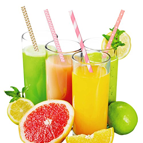 Paper Straws - 200-Pack Pink, Gold, and Peach Colored Fun Drinking Straws with Coral Stripes, Polka Dot, and Star Designs by Esdabem
