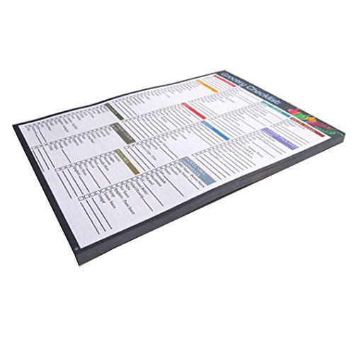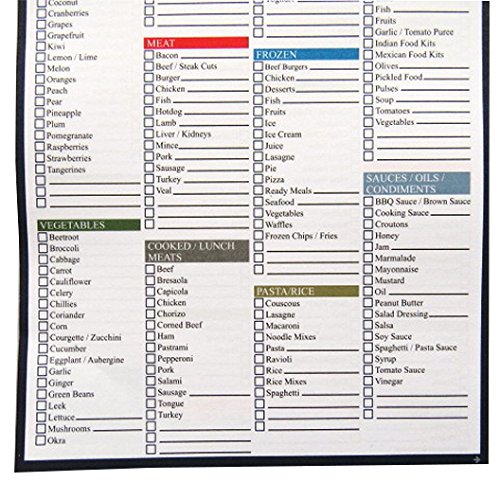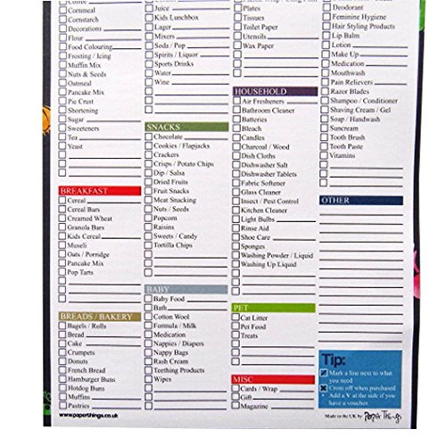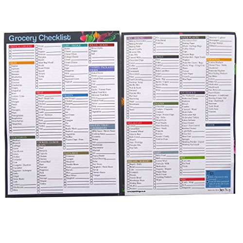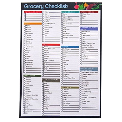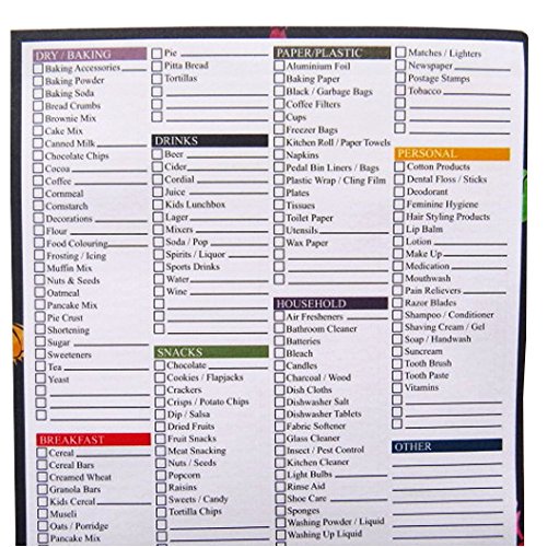 -. Feature : A5 "Grocery / Food Shopping Ticklist & Checklist Organiser Notepad" Size 8.3 x 5.8 / Organise your daily, weekly, monthly food shopping quickly, effectively / Use as a reference for discount vouchers, save money by grocery shopping for the things you need rather than impulse buy / Separated into 25 categories, Diary, Bread, Sauces etc' Lots of food items listed in these categories to tick when needed at home / cross off when obtained at the supermarket / 50 Sheets per pad on 110gsm Premium Brilliant White Offset (FSC Paper), grey board back for stability, glued on the short edge (148mm)