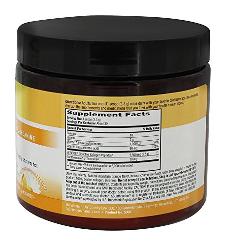-. Binding : Health and Beauty -. Brand : Country Life -. EAN : 0015794050681 -. Feature : SUPPORTS ALL 3 LAYERS OF THE SKIN - Maxi-Skin Zen provides you all the skin benefits of the original formula with the addition of L-theanine and comes in a Mandarin Orange and Chamomile flavor. This deliciously refreshing product includes ingredients that Type I and III collagen blend supports all three layers of the skin. / HOW IT WORKS - CLINICALLY STUDIED VERISOL Bioactive Collagen Peptides (Type I and III collagen) enhance skin elasticity, increase skin collagen by 60% and reduce depth of eye wrinkles. SKIN SUPPORTING VITAMIN C protects skin from cell-damaging free radicals and helps collagen formation in the dermis layer while VITAMIN A helps skin cell renewal in the epidermis layer. / GLUTEN FREE - Gluten Free Certification for this Dietary Supplement provided by GFCO.org. / CONTAINS ABSOLUTELY NO: Yeast - Wheat - Soy - Milk - Salt - Preservatives - Artificial Colors - Artificial Flavors - Artificial Sweeteners - Magnesium Stearate - GMOs / COUNTRY LIFE PLEDGE OF INTEGRITY - means that every product we provide comes with a guarantee of high quality and purity in every bottle. -. IsAdultProduct : 0 -. Label : Country Life -. Manufacturer : Country Life -. MPN : 05068 -. PackageQuantity : 1 -. PartNumber : 05068 -. ProductGroup : Health and Beauty -. ProductTypeName : HEALTH_PERSONAL_CARE -. Publisher : Country Life -. Size : 3.5 oz (100 g) -. Studio : Country Life -. Title : MAXI-SKIN Zen with L-Theanine Country Life 3.5 oz (100 g) Powder -. UPC : 015794050681