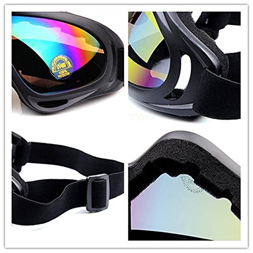 -. Feature : UNIQUE DESIGN --- Enhanced PC Lenses and colorful Frame.A Complete Upgrade Version of the Old generic Vintage Goggles.With high transparency, it resistances to scratch, anti-collision, anti-UV / ABSOLUTELY SAFETY --- It fits closely to your face around your eyes to protect you from water,wind and dust.Super toughness,protect your eyes better. / SILICONE STRAP --- Extra-long size strap made of durable nylon suitable for skier with different head size / ADVANTAGE --- Comfortable, safe and wind-proof - Made of high quality multiple layer foams, the padding ensure the cozy wearing. Strong impact-resistance lens and durable frame protect you from any incidents occurred / APPLICATION --- Used for outdoor activities, such as cycling, climbing, riding and other activities.Sunglasses,sport glasses,snowboard goggles,Motorcycle Goggles,also you can wear it to protect your eyes during the playing games.