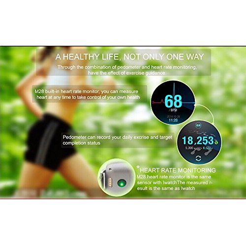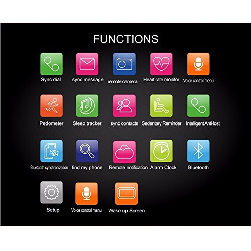 Other Features: Runtastic Heart Rate PRO/ Pedometer/Sleep monitoring/Sedentary Reminder/Low power consumption/Water resistant for daily life/Full fit screen/Sync dial/sync messag/sync contacts/Control the mobile music media/ sync QQ and wechat message, face book message/Remote photograph/Rename the watch bluetooth/The hand wake up bright screen/ A variety of standby style free switch/Voice control the menu