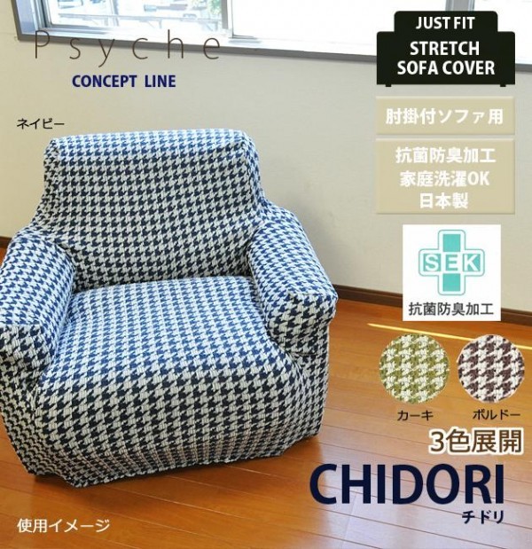 | 抗菌防臭加工済み!チドリ柄の伸縮フィット式ソファカバー!! |