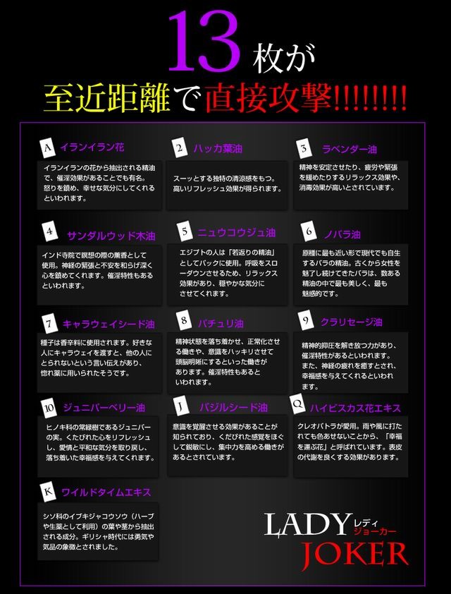 | 原材料 | 水、エタノール、イランイラン花油、ハッカ葉油、ラベンダー油、ニュウコウジュ油、サンダルウッド木油、ノバラ油、キャラウェイシード油、パチュリ油、クラリセージ油、ジュニパーベリー油、バジルシード油、イワベンケイ根エキス、ガラナ種子エキス、ワイルドタイムエキス、ザクロ花エキス、ハイビスカス花エキス、アルテア根エキス、PEG-40水添ヒマシ油、BG、ペンチレングリコール、香料、メチルパラベン、 |