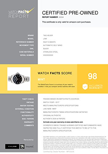 -. Binding : Watch -. Brand : TAG Heuer -. Department : mens -. Feature : Tag Heuer Link WJ2110.BA0570 with stainless-steel bezel and black dial / Authenticated by WatchFacts. Grade Rating: 98 / Condition: Mint / Comes with original box and manufacturer's papers offered with this watch / Automatic-self-wind movement / Watch year: 2017 -. Label : Tag Heuer -. Manufacturer : Tag Heuer -. MPN : A2HN-DA2767LINK-VX-CPO -. NumberOfItems : 1 -. PackageQuantity : 1 -. PartNumber : A2HN-DA2767LINK-VX-CPO -. ProductGroup : Watch -. ProductTypeName : WATCH -. Publisher : Tag Heuer -. Studio : Tag Heuer -. Title : Tag Heuer Link automatic-self-wind mens Watch WJ2110.BA0570 (Certified Pre-owned)
