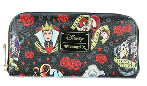 The evil female Disney villains are featured with a tattoo design on this licensed Disney wallet. All-over print featuries Queen Grimhilde, otherwise known as The Evil Queen from Snow White and the Seven Dwarves, Cruella De Vil from One Hundred and One Dalmatians, Maleficent from Sleeping Beauty, Ursula from the Little Mermaid and the Queen of Hearts from Alice in Wonderland. This boutique-quality wallet has a gold and black resin metal label with both Disney and Loungefly's logos. Zip around closure. Keep all your bills, ID, checkbook, coins and cards in one place. 8 card slots, 2 bill-size/checkbook slots, and is divided by a center zippered compartment which makes two additional slots to stash your receipts. 8 in x 4 in x 1 in. Vegan friendly.