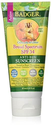 One of Badger's most popular Sunscreens the Badger SPF 34+ Face and Body Sunscreen is now available with an all natural Insect Repellent! The new all in one sunscreen has been tested to be effective for up to 4 hours. All Badger Sunscreens are created with all Natural and Organic ingredients. The Badger Sunscreen is made with no chemicals, environmentally friendly and formed with an oil and wax balm base to ensure the most effective water resistant sunscreen out there! The active ingredient, Zinc Oxide, is a natural mineral that protects the skin from harmful UVB and UVA rays. The sunscreen forms a protective barrier that sits on top of the skin and fights off the UV rays that can be absorbed with regular sunscreens. Also contains Organic Olive Oil, Cocoa Butter and Shea Butter that moisturizes the skin while protecting it against the sun. Highest ratings from the Environmental WorkingFeature