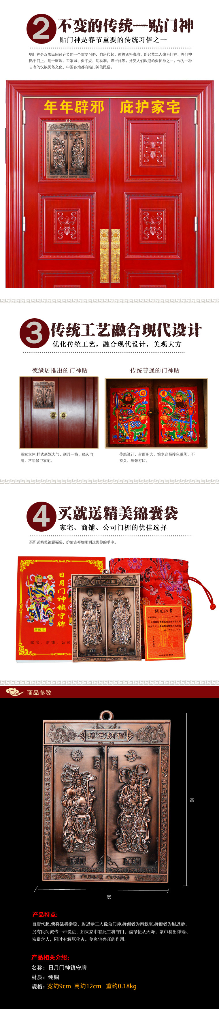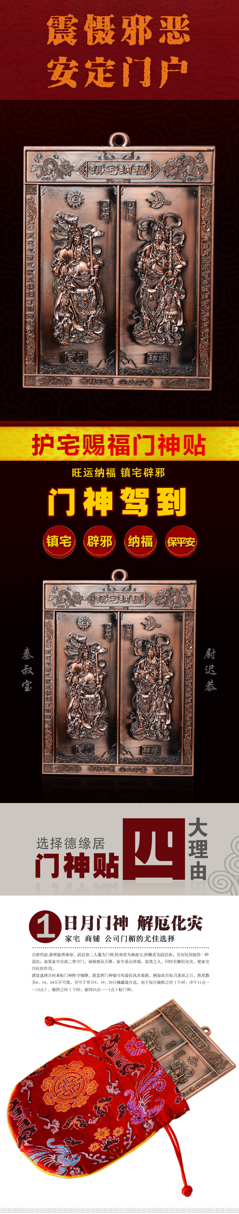 据明《正统道藏》中的《搜神记》和《三教搜神大全》及《历代神仙通鉴》等记载,二门神为唐代秦琼(秦叔宝)、(尉迟恭尉迟敬德)二将军。相传唐太宗身体不太好,寝宫门外有恶鬼耶魅号叫,六院三宫,夜无宁日。于是太宗将全部情况告诉众大臣,秦叔宝上奏说:"臣平生杀人如摧枯,积尸如聚蚁,何惧小鬼乎!愿同敬德戎装以伺。”太宗准奏,夜晚让二人立于宫门两侧,一夜果然平安无事。太宗嘉奖二人后,觉得整夜让二人守于宫门,实在辛苦,于是命画工画二人像,全装怒发,手执玉斧,腰带鞭练弓箭,一如平时,悬挂在两扇宫门上,从此耶祟得以平息。直到元代人们才沿袭这种做法,奉二人为门神。此前曾有过类似的记载,不过均未说明是此二人,如南宋佚名氏《枫窗小椟》曰:"靖康以前,汴中家户门神多番样,戴虎头盔,而王公之门,至以浑金饰之。”宋赵与时《宾退录》云:"除夕用镇殿将军二人,甲胄装。”直到明清以后,书中记载才明确为秦琼尉迟恭二人,如清顾禄《清嘉录·门神》中云:"夜分易门神。俗画秦叔宝尉迟敬德之像,彩印于纸,小户贴之。”清李调元《新搜神记·神考》:"今世惜相沿,正月元旦,或画文臣,或书神蒂郁垒,或画武将,以为唐太宗寝疾,令尉迟恭秦琼守门,疾连愈。”另据今人张振华常华《中国岁时节令礼俗》记载:"贴门神,历史悠久园地方不同,时代不同贴用的也不同。北京多用白脸儿的秦叔宝和黑脸儿的尉迟敬德。至今仍有住户这样做,以祈人安年丰。”表明二神从受祀岍,至今仍然被人们所祀奉