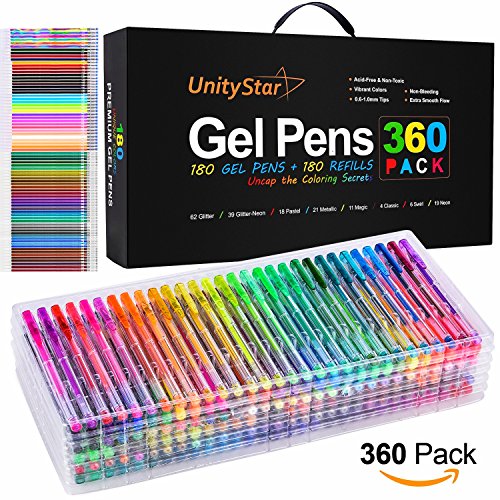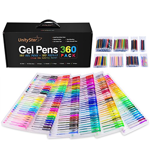 Gel Pens for Coloring, UnityStar 360 Set of Colorful Gel Pens with 180 Colors & 180 Ink Refills and Gift Box for Adult Coloring Books Drawing Doodling Crafts (No Duplicate)