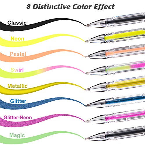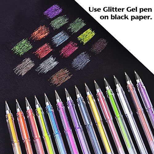 - SMOOTH & INSTANT-DRY INK FOR SMEAR-FREE DRAWINGS: The richly pigmented ink from these Gel Pens for Coloring flows smoothly and ensures that you write at least 120 meters with the glitter ones and 180 meters with others. And the instant-dry feature of the ink leaves you smear & smudge-free hands and drawings.