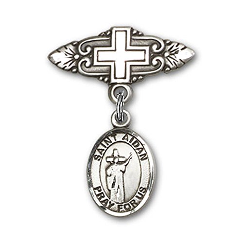 -. Title : Sterling Silver Baby Badge with St. Aidan of Lindesfarne Charm and Badge Pin with Cross 1 X 3/4 inches