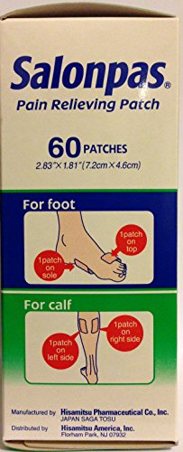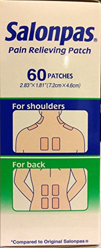 - Feature : Salonpas Pain Relieving Patches / Apply For 8 Hours / Relieves: Stiff Neck, Sore Shoulder, Backache, & Joint Pain / 60 Count Patches Per Box / Pack of 2 Boxes Per Quantity Ordered (120 Count Patches Total)