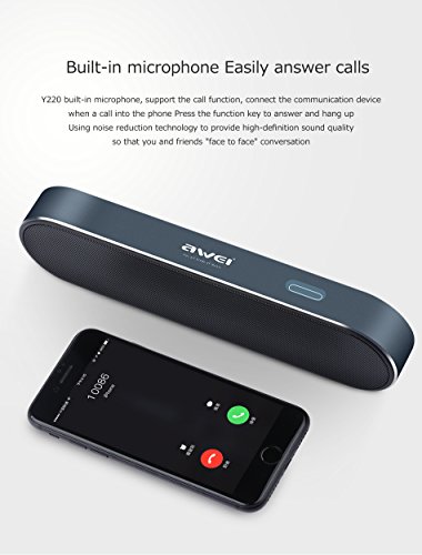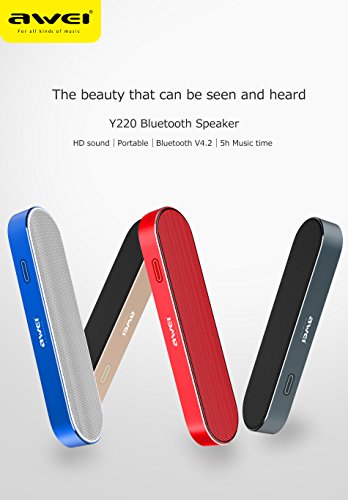-. Feature : CRYSTAL CLEAR 3D STEREO SOUND! Enjoy a unique acoustic experience with distortion-free, robust, MAX volume sound with AWEI V4.2 wireless Bluetooth speaker! Let the crisp 80dB sound of this enhanced bass Bluetooth speaker fill your bedroom, classroom, travel, party or sports activities! The DUAL 3W precision acoustic drivers of this extra bass speaker are made for your music enjoyment on the go! / COMPACT, LIGHTWEIGHT & TRAVEL-FRIENDLY: Compact (220x55x25mm) and feather-like to carry, our wireless Bluetooth speaker system will be tossed into your backpack to join you in your hiking, walking, running or bike rides! The KILLER capacity rechargeable 2000 mAh Lithium Ion battery guarantees up to 5 hours of playtime, 10 hours talk time and full charge within 3.5 hours! / SLEEK & FUNCTIONAL OVAL PERFECTION! Youthful, trendy and offered in BLUE, BLACK, GOLD and RED, AWEI oval Bluetooth speaker will thrill you with its stylish design! Practical and functional, it offers EASY ACCESS to Bluetooth, TF Card Playback, USB disk playback and AUX input, volume up/down. Full 10m transmission distance complements the profile of the best Bluetooth speaker for men and women! / CONSISTENT CONNECTIVITY MADE A BREEZE!Connect within seconds with iPhone, iPad, iPod, Mac, Smartphones, Tablets, Laptops or your desk computer! With a Built-in Microphone for HANDS-FREE speakerphone, a micro-USB CHARGING CABLE and the handy INSTRUCTIONS MANUAL, our Bluetooth Stereo speaker/receiver makes a TREMENDOUS VALUE pack that stands out for quality, connectivity and design! / A STUNNING GIFTING IDEA! SurP.R.Ise a loved sports addict, nature lover or travelling enthusiast with the most reliable Bluetooth music speaker on the market! Stylish, sturdy and with ULTRA HIGH sound performance, AWEI Y220 music player Bluetooth speaker will put a wide smile on the face of the lucky recipient as a birthday, Christmas, Valentine's or impulse gift!