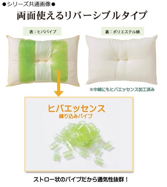 ヒバエッセンス練り込みパイプを使用した枕です。パイプ使用のため、通気性がよく、熱がこもらず心地よくご使用できます。リバーシブルタイプでひばパイプ側、ポリエステルわた側の2種類の触感を楽しめます。(中材の出し入れはできません) |