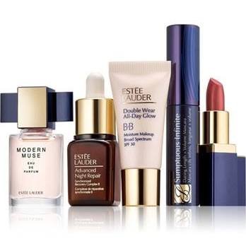 -. Feature : Set Includes: Advanced Night Repair Synchronized Recovery Complex II (0.24 oz.) / Double Wear All Day Glow BB Moisture Makeup Broad Spectrum SPF 30 in Intensity 1.0 (0.24 oz.) / Sumptuous Infinite Daring Length + Volume Mascara in Black (0.09 oz.) / Pure Color Envy Sculpting Lipstick in Dynamic (0.12 oz.) / Modern Muse Eau de Parfum (0.14 oz.)