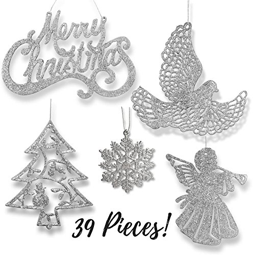 Silver Christmas Ornaments - Pack Of 39 Silver Glitter Ornaments - Merry Christmas, Angels, Doves, Xmas Trees And Snowflakes - Christmas Decorations