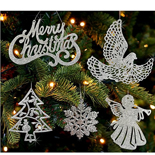 - SILVER GLITTER angels, Xmas trees and merry Christmas hanging ornaments. Each ornament is packaged with silver cords for you to attach them to the ornaments or be creative and use your own decorative string.