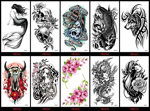 GGSELL GGSELL look like real temporary tattoos 10pcs Halloween fake tattoo stickers in a packages,includingwolf,dragon,flowers,lady, skull...