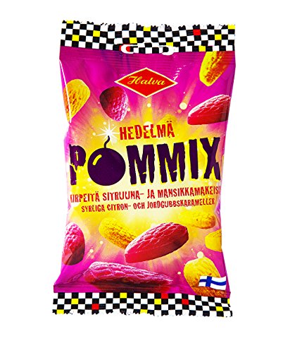 -. Feature : Halva Pommix Hedelmä / Hard lemon and strawberry candies, sour powder inside and outside / Classic Finnish caramel candy / Package includes 2 individual 3,53 oz bags / Made in Finland