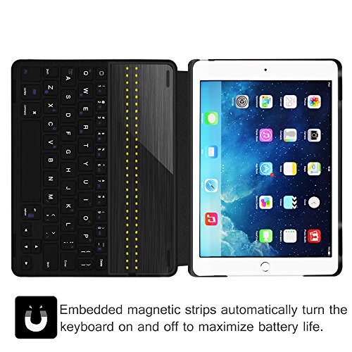 Embedded magnetic strips automatically turn the keyboard on and off to maximize battery life.