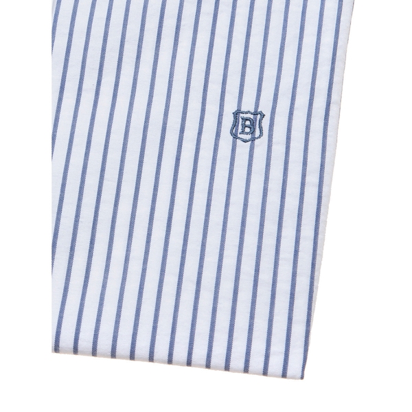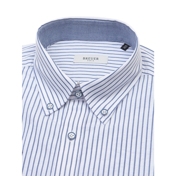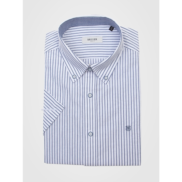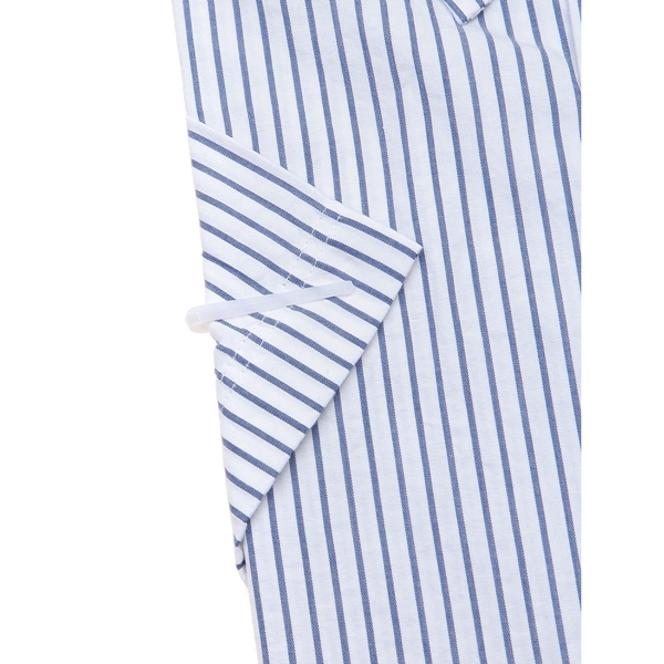 면서커 소재의 화이트 블루 스트라이프 원단으로 시원한 느낌을 더해준 버튼다운 반팔셔츠이며