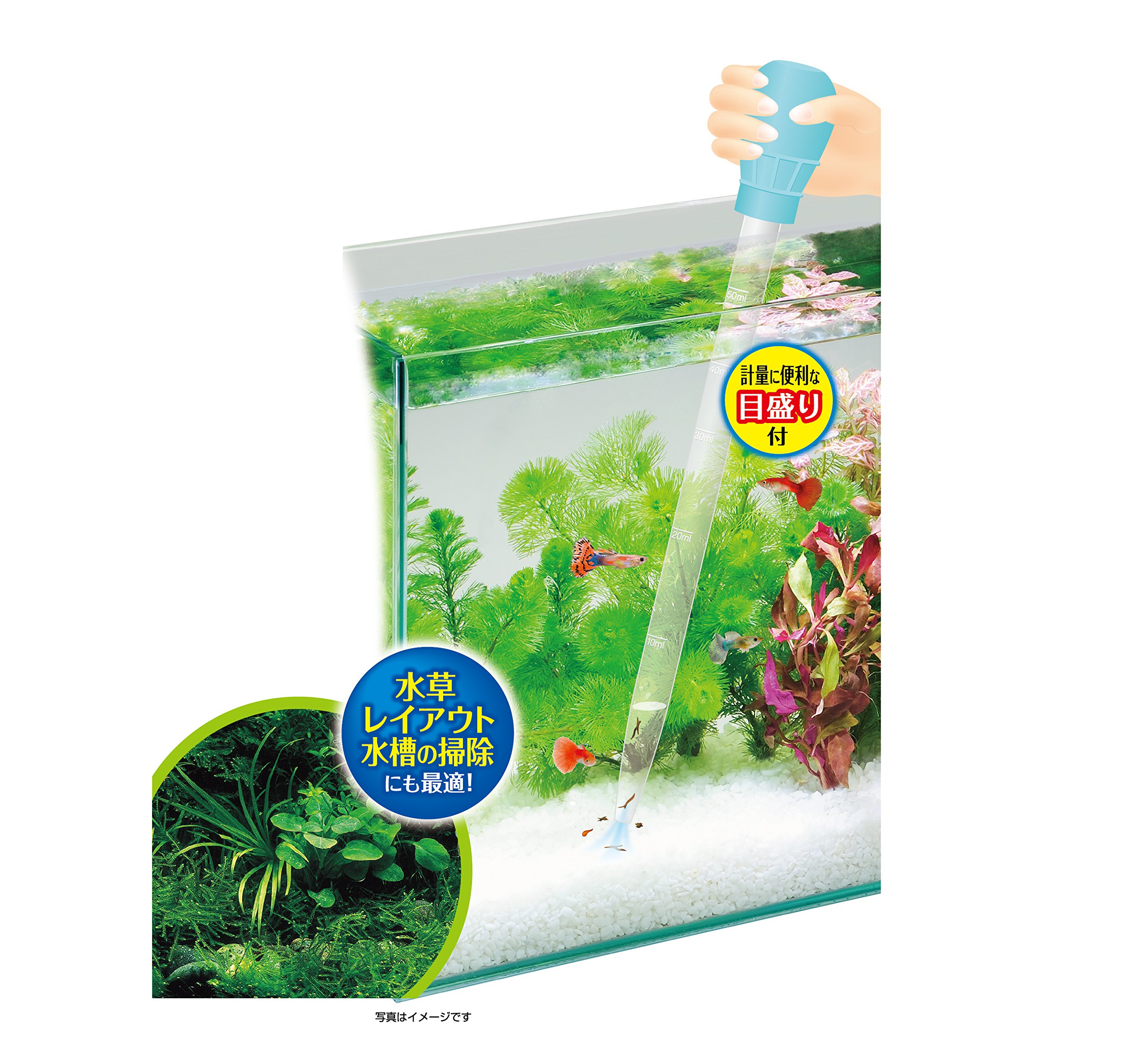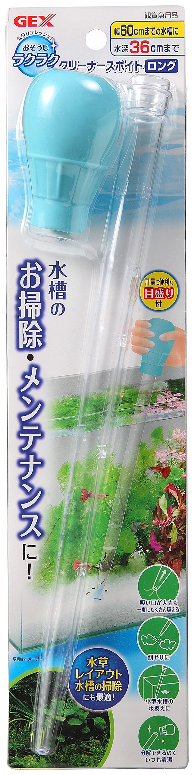 · Removal of dirt and residual bait that has settled on the bottom of the aquarium, water change of a small aquarium, etc. It is the optimum eyedropper for maintenance of the aquarium.