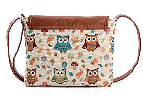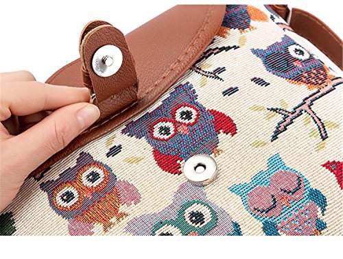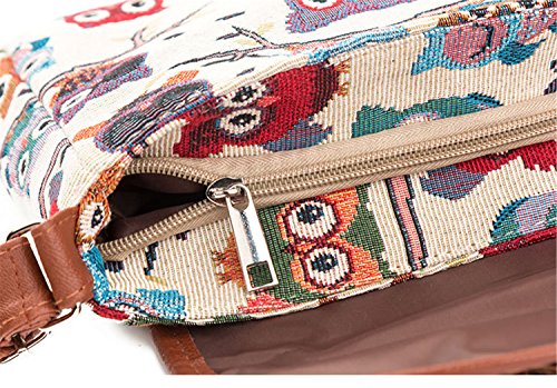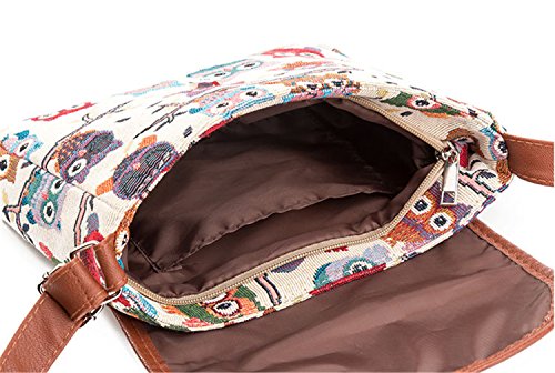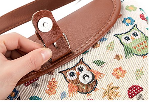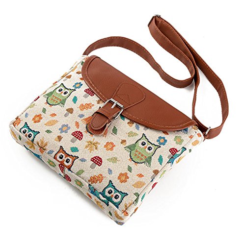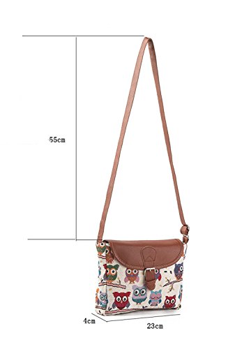 -. Feature : Material: High density canvas fabric&Pu Leather / Pattern:Cute owl,Lovely and fashion / Size info: 23cm×20cm×4cm ,adjustable strap(55cm),can put phone,wallet,glass,key,lipstick,and other little thing. / Magic buckle Closure outside and Zippered Top Closure inside,Keep your Item safe.convenience to hold your little things.a small wallet pocket inside to storage key,pen coin ect. / It fit any occasion,shoping,working,beaching ect.It best for women and lady.
