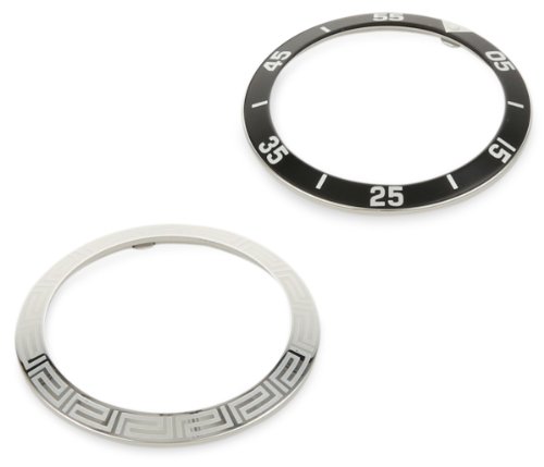 Feature : Round watch in stainless steel with Medusa at 12 o'clock, logo-engraved bezel, and croco-embossed leather band / Precise ETA G15.261 Swiss quartz movement with analog display / Protective anti-reflective sapphire crystal dial window / Features interchangeable top ring, chronograph subdials, date window, and deployment push-button clasp with buckle / Water resistant to 165 feet (50 M): suitable for swimming and showering