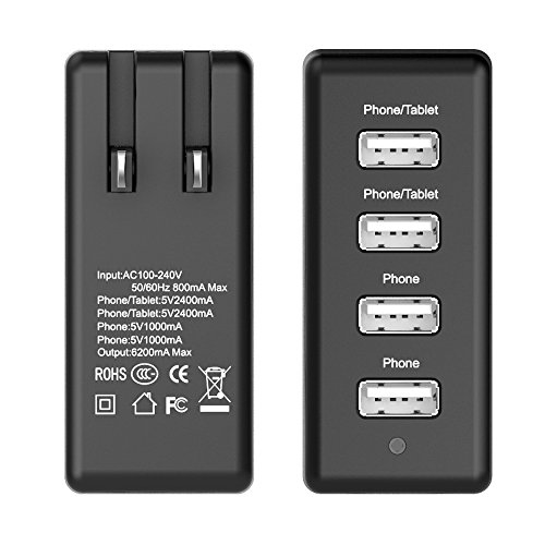 Multipotent with strong power: two regular 5V 1A ports for smart phone and two 5V 2.4A super charged ports for iPad and tablets.