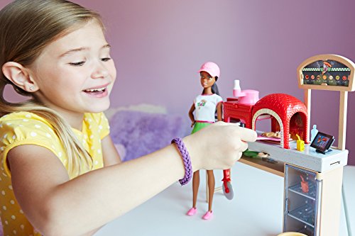 -. Feature : Cook up fun with a pizza play set that comes with Barbie doll, an oven with creative working features and all the ingredients to make, "bake" and serve pizza, including 3 different colors of dough! / Use the included dough -- white, beige and red -- to create pizzas in a few, easy steps: place the beige and red dough into the pizza press and flatten for the pizza crust and sauce; move it along the conveyor belt by sliding the lever to the next station; fill the toppings shredder with white dough and turn the hand crank to sprinkle "cheese" onto the pizza; then slide the lever again to move the pizza into the oven! / When it's "baked" long enough, slide it out with the pizza slider and cut it up with the slicer! / Use the spatula to serve slices on the two green plates or send the whole pie out in a pizza box! / Take orders and payment at the register that sits on the counter under the menu