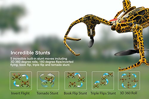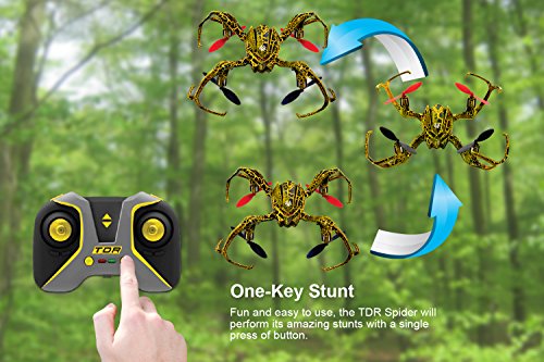 -. Feature : Fun and easy to use one-key-stunt design, perform amazing stunts with a single press of button. / 5 incredible stunt moves: 3D 360 degree roll, 180 degree flip/inverted flying, book flip, triple flip and tornado stunt. / Packed with easy to fly technology like Auto Return, and Advance Headless mode, helps beginners fly like a pro in no time. / The latest 6-axis flight control system is easier than ever to control, with stronger wind resistance, and greater stability. / Built with high performance motor and durable mainframe; allowing the TDR Spider to fly even in more windy outdoor conditions.