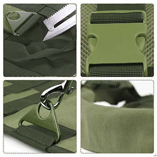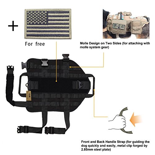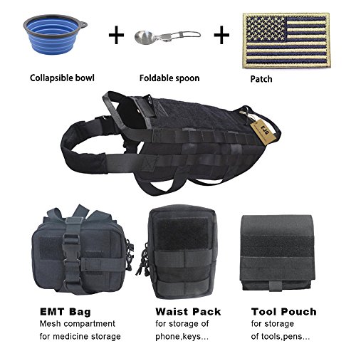 -. Feature : MATERIAL:1000D nylon fabric,waterproof,dry faster;KAM plastic button;AAA high quality. / FOR OUTDOOR: It's great for camping, hiking, traveling & training, etc. / MOLLE SYSTEM DESIGN: Both sides of this dog vest are molle-type design, it can hang all the modle system pouches and equipment, providing your dog with a full range of extension. / HANDLES: Two carry handles are attached to both the front and back of the harness,providing two attachment points for a leash. / Bonus: One collapsible bowl, one foldable spoon & one patch, (Color random delivery)