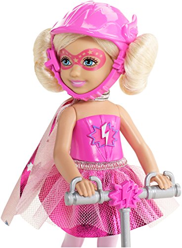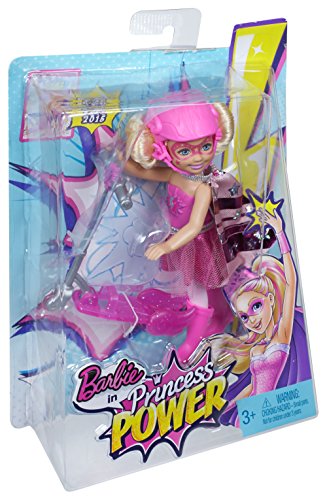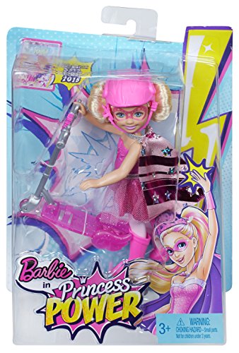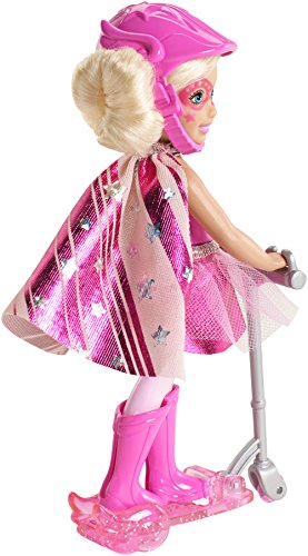 In Barbie in Princess Power movie, a modern-day princess is kissed by a magical butterfly and discovers she has super powers. Will she join forces with her “super” friends and rid the kingdom of its enemy? Girls can play out the story with this adorable doll dressed up as her favorite superhero! Plus, she comes with a scooter so she can get to the action quickly. Doll sparkles in a purple and pink shiny dress with star-decorated cape, tall boots and matching helmet. Place doll onto the scooter, sliding feet and hands into the slots, to speedily show her support. Her scooter matches her costume and has adorable superhero details. Girls will love recreating scenes and imagining new adventures with this charming doll! Includes scooter and doll wearing fashion and accessories. Ages 3 and older.Feature