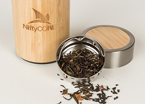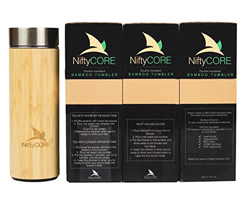 Premium Bamboo Travel Tumbler By NiftyCORE - Double Wall Insulated Stainless Steel Interior - Leak Proof Travel Coffee Mug With Lid & Strainer - Ideal Tea & Fruit Infuser - 14 oz / 400 ml